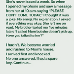 “I called Mom. No answer. Have you talked to her?”