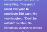 Not like “haha I thought you were joking” laughed. I mean she actually laughed at me, right there in front of a few relatives while we were together later that week, and said, “Don’t be selfish; it’s Christmas.”