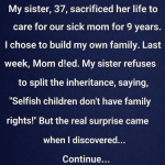 Meanwhile, I focused on raising my own family. Last week, our mother pa:ss:ed away. Since then, Cynthia has refused to share the inheritance, accusing me of being a “selfish child who forfeited her family rights.”