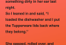 My wife asked me to whisper something dirty in her ear last night. So I leaned in and said, “I loaded the dishwasher and I put the Tupperware lids back where they belong.”