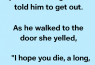 A wife got so mad at her husband that she packed his bags and told him to leave. As he walked to the door, she yelled, “I hope you die a long, slow, painful death!”