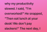His angry words from the previous day filled the conference room: “Then eat lunch at your desk! We don’t pay slackers to sit around and complain!”