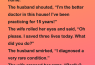 The wife rolled her eyes and said, “Oh please. I saved three lives today. What did you do?”