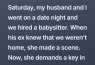 My 7 y.o. stepson stays over on the weekends. On a Saturday, my husband and I went on a date night and we hired a babysitter. When his ex knew that we weren’t home, she made a scene. Now, she demands a key in case there’s an emergency. My husband told me, “I think it might not be such a bad idea. Just for emergencies.”