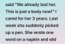 Just that. She hadn’t spoken or written a single word in 3 years. She chose that one. I had to leave the room so she wouldn’t see me fall apart. But as I wiped my tears, I realized she still knew love and connection, and that was enough to fill both our hearts. And later that night, I noticed something I had never paid attention to before—she had been squeezing my hand slightly every evening, like she had been trying to speak to me all along.