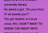The girl replied, in a loud voice, NO, I DON’T WANT TO SPEND THE NIGHT WITH YOU!” All the people in the library started staring at the man, who was deeply embarrassed and moved to another table.