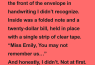 Inside was a folded note and a twenty-dollar bill, held in place with a single strip of clear tape.