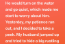 My husband started spending a long time in the bathroom. He would turn on the water and go quiet, which made me start to worry about him. At first, I ignored it. Then I started imagining all sorts of scenarios—what if he slipped? What if something happened?