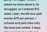 I didn’t want to be the “difficult” one on the team, so I went along and kept a smile on my face. While everyone else was tucking into ribeyes and expensive bottles of red wine, I ordered a $12 garden salad and some plain steamed broccoli. It was fine, honestly; I was there for the camaraderie, not the food. But the vibe shifted when the check arrived at the end of the night. It didn’t just arrive—it landed, heavy and deliberate, like a prop in a play where everyone knew their lines except me.