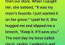 It was a small brooch—delicate, old-fashioned, shaped like a flower with a tiny blue stone in the center. The metal felt strangely warm despite the chill in her hands, and for a brief moment, I could have sworn the stone caught the light in a way that didn’t match the dim room. I tried to refuse, but she shook her head, already backing toward the door.
