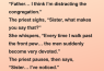 She whispers, “Every time I walk past the front pew… the men suddenly become very devoted.”