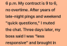 I didn’t announce a boundary—I just stopped replying after 6 p.m. My contract is 9 to 6, no overtime. After years of late-night pings and weekend “quick questions,” I finally reached my limit and muted the chat. I was tired of being in the middle of a nice dinner or halfway through a movie only to have my phone buzz with a so-called “urgent” request that could easily wait until Monday. At first, even the silence felt loud—like I was doing something wrong, something punishable—but I held my ground, letting the unread messages stack up like a quiet act of rebellion.