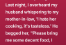 I’m Clara, 36, and I love cooking for my husband, Mark, and our teenage stepson. I take pride in making meals from scratch, experimenting with flavors, and trying to create something special. But last night, I overheard Mark telling my MIL, “I hate her cooking, it’s tasteless. Please bring me some decent food, I miss your cooking.” I froze. All my effort, all my care, dismissed in a whisper. And he was asking his mom to swoop in behind my back. I stood there in the hallway, unable to move, replaying every meal I had ever made as if it had all been a lie I didn’t notice.
