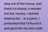 That morning, I had a very important job interview. I stepped out of the house, and there was immediate chaos: a woman had lost her money. She was standing by the bus stop near my flat in North London, frantically patting down the pockets of her oversized coat and dumping the contents of a tattered handbag onto the pavement like her life depended on it. Her face was a mask of pure, unfiltered panic, the kind that makes your stomach drop just by looking at it. I could hear her whispering to herself, “Please, no, not today,” over and over again, as she scanned the wet concrete for a twenty-pound note that clearly wasn’t there anymore.