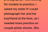 When I started doing photography, I was only looking for models to practice on. I asked my sister if I could photograph her and her boyfriend at the time, since I needed more experience with couple shoots. She agreed, but on the day of the session, she canceled at the last minute, saying they’d had a small argument and needed some time apart.