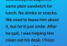 I didn’t know what to say. Every joke we had made about his “sad little sandwich” suddenly felt like something sharp I wished I could take back.