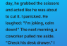 One day, he grabbed the scissors from my pen pot and acted like he was about to cut a thick strand right off. I felt the cold metal of the blades hover just an inch from my neck, and the sound of them snapping shut in the air made my heart stop. I panicked, spinning around so fast I nearly knocked over my coffee, my hands flying up to protect my head. For a split second, I was sure I felt the faintest brush against my hair, as if he had already taken something. He just laughed, a dry and hollow sound, and set the scissors back down on the desk.
