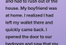 Once, I was late to work and had to rush out of the house. My boyfriend was at home. I realized I had left my wallet there and quickly came back. I opened the door to our bedroom and saw that my boyfriend was shirtless, standing far too close to his phone, looking nervous.
