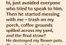 The next morning started with a chalk line of coffee grounds across my porch. It stretched from my front door to the edge of the steps like someone had spilled it on purpose.