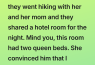 My husband has a very good female friend. Once, they went hiking with her and her mom and they shared a hotel room for the night. Mind you, this room had two queen beds. She convinced him that I wouldn’t mind if they slept in the same bed and he agreed.