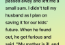 Recently, my uncle passed away and left me a small sum. I didn’t tell my husband as I plan on saving it for our kids’ future. When he found out, he got furious and said, “My mother is ill, and you kept this from me?”