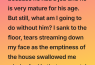 I knew he would be alright because he had a job and he is very mature for his age. But still, what am I going to do without him? I sank to the floor, tears streaming down my face as the emptiness of the house swallowed me whole. And in that moment, I realized I had built my entire life around being his mother.