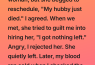 I set a job interview with a woman, but she begged to reschedule, “My hubby just died.” I agreed. When we met, she tried to guilt me into hiring her, “I got nothing left.” Angry, I rejected her. She quietly left.