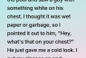 I didn’t have my glasses on at the pool and saw a guy with something white on his chest. I thought it was wet paper or garbage, so I pointed it out to him, “Hey, what’s that on your chest?” He just gave me a cold look. I put my glasses on and realized it was a surgical scar.