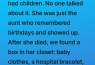I learned that a “quiet life” is often the loudest testimony to a person’s character, echoing long after they’re gone. Aunt Martha wasn’t a woman who missed out on life; she was a woman who defined it on her own terms, through a love so deep it was willing to be invisible, to be forgotten, if it meant someone else could feel whole. I’m proud to be the son of two mothers—one who gave me life, and one who gave me a future. And I will carry her strength, her silence, and her impossible choice with me until it’s my turn to leave a box in a closet, and trust that someone, someday, will understand.