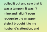Then he took the tampon from my hand, held it up, and said, “This one?” Then he reached for his phone and texted his sister.