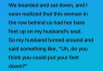 We boarded and sat down, and I soon realized that this woman in the row behind us had her bare feet up on my husband’s seat.