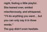 He grinned, looked her straight in the eyes, and said: