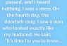 At a restaurant during lunch, a large man stared at me without blinking the entire time I ate. As I left, he quietly said, “You shouldn’t be out alone. Someone’s going to grab you and steal you away.”