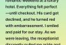 My boyfriend planned a romantic weekend at a luxury hotel. Everything felt perfect—until checkout. His card got declined, and he turned red with embarrassment. I smiled and paid for our stay. As we were leaving, the receptionist discreetly pulled me aside and said, “Be careful, I’ve seen this guy do the same thing with other women. He comes here, his card gets declined, and they end up paying for everything.”