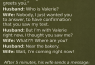 Valerie greets you.” Husband: “Who is Valerie?” Wife: “Nobody, I just wanted you to answer, to have confirmation that you saw my text.” Husband: “But I’m with Valerie right now,