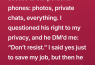 Everyone else in the chat reacted with thumbs-up emojis like it was nothing. I felt this immediate knot in my stomach. My phone has my photos, banking apps, medical info, my entire life!!! So I politely asked what kind of monitoring it involved. He DM’d me: “Don’t resist.” That line felt like a quiet threat, the kind that curls at the back of your neck and refuses to leave. I panicked and just replied “Okay.” I need my job. I pay rent. I’m not trying to become unemployed over a group text.