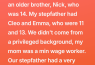 When Mom and Liam got married, our family of three suddenly became a family of six. Except… we weren’t really a family, at least not in the way you’d imagine. “We’ve decided to keep our finances separate,” Mom explained to Nick and me one evening, almost rehearsing the words as if she expected resistance.