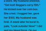 An old woman was begging outside a store. My husband sneered, “Get lost! Beggars carry filth,” and kicked over her coin box. She cried softly, gathering scattered coins with shaking hands. I hugged her and gave her $100. My husband was furious, saying I had embarrassed him.