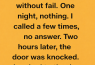 My boyfriend always texted when he left work—every day without fail. One night, nothing. I called a few times, no answer. Two hours later, there was a knock at the door.