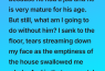 I knew he would be alright because he had a job and he is very mature for his age. But still, what am I going to do without him? I sank to the floor, tears streaming down my face as the emptiness of the house swallowed me whole. And in that moment, I realized I had built my entire life around being his mother.