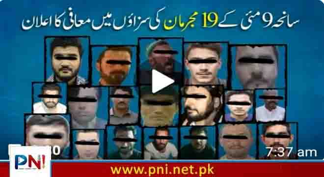 سانحہ 9 مئی کے 19 مجرمان کی سزاؤں میں معافی کا اعلان، ویڈیو Posted on January 2, 2025 by Tuba Zafar WhatsApp Video 2025-01-02 at 13.00.32_c730933e تازہ ترین خبروں کے لیے پی این آئی کا فیس بک پیج فالو کریں