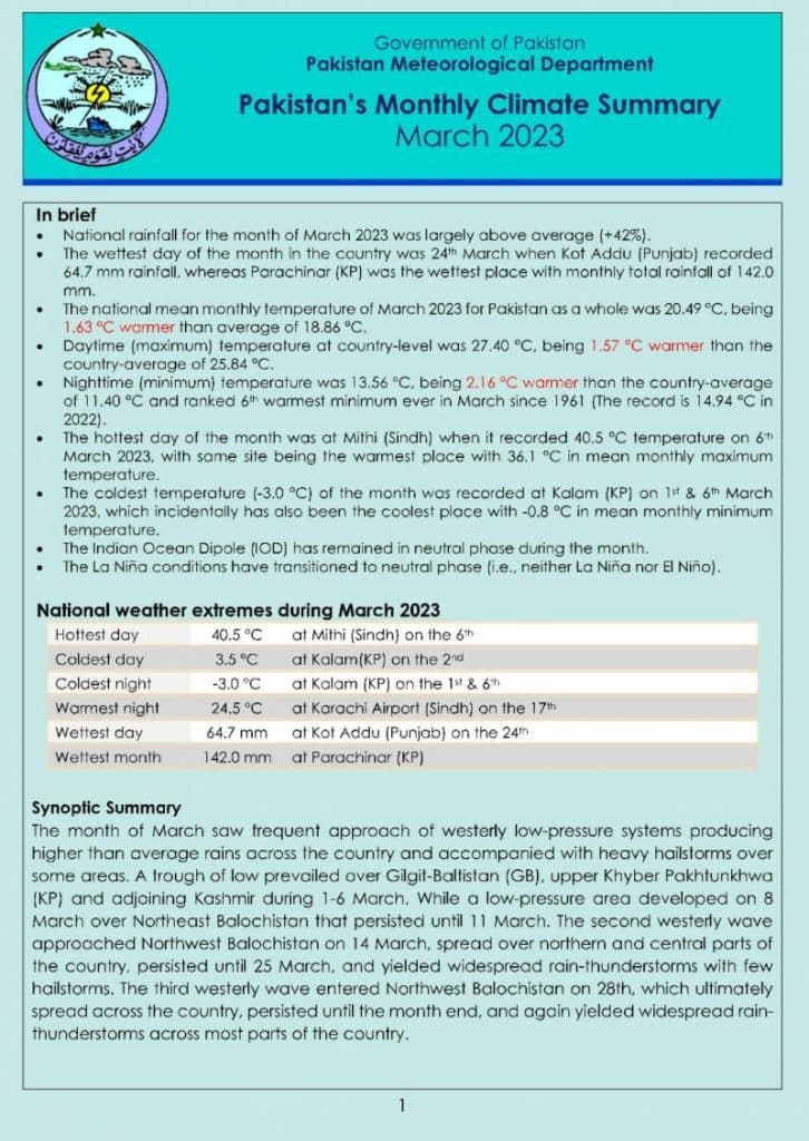 محکمہ موسمیات کے مطابق سب سے گرم دن کے دوران مٹھی میں 6مارچ کو40.5ڈگری ریکارڈ ہوا،سب سے سرد دن اورسرد رات کالام میں یکم مارچ سے6مارچ کے درمیان ریکارڈ ہوئے۔ محکمہ موسمیات کا اپنی رپورٹ میں کہنا ہے کہ سب سے گرم رات 17مارچ کو کراچی ائیرپورٹ پر24.5ڈگری درجہ حرارت کے ساتھ ریکارڈ ہوئی،رواں سال مارچ میں بارش معمول سے42 فیصد زائد رہی، پنجاب میں 24 مارچ کو کوٹ اڈو 64.7 ملی میٹر بارش کے ساتھ زیادہ بارش برسنے والا دن رہا،مارچ میں پارا چنار میں 142 ملی میٹر بارش کے ساتھ بلند بارش کا مہینہ رہا۔ لاہور میں موسلا دھار بارش، محکمہ موسمیات کی ملک بھر کے موسم سے متعلق بڑی پیشگوئی مارچ میں ملک دن اور رات کا درجہ حرارت معمول سے 1.63ڈگری سینٹی گریڈ زائد رہا،ملک کا دن اور رات کا معمول کا اوسط درجہ حرارت 18.86 ڈگری سینٹی گریڈ ہے، ملک میں مارچ میں دن اور رات کا درجہ حرارت 20.49ڈگری سینٹی گریڈ ریکارڈ کیا گیا۔