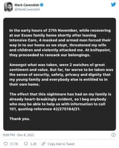 لندن (پی این آئی) برطانیہ کے مشہور سائیکلسٹ مارک کیونڈش کے گھر میں ڈکیتی ہوئی ہے اور ڈاکوؤں نے خود ان کو اوران کے اہل خانہ پر تشدد کیا ہے، ڈکیتی کے لیے آنے والے ایک بریف کیس اور 2 قیمتی گھڑیاں چرا کر فرار ہوگئے۔برطانوی میڈیا رپورٹس کے مطابق معروف برطانوی سائیکلسٹ مارک کیونڈش نے اپنی سوشل میڈیا پوسٹ میں انکشاف کیا کہ 27 نومبر کی رات 4 افراد ان کے گھر میں داخل ہوئے اور چاقو کی نوک پر ان کو ان کے اہل خانہ کو ہراساں کیا اور تشدد کا نشانہ بنایا۔اس پوسٹ میں مارک کیونڈش نے کہا کہ چور بریف کیس اور دو قیمتی گھڑیاں اٹھا کر لے گئے۔