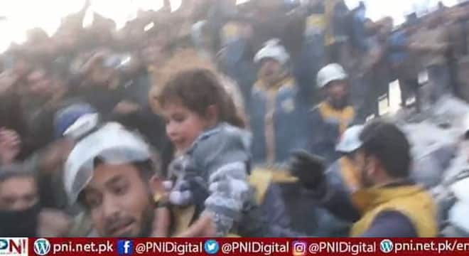 ادلیب (پی این آئی) شامی شہر ادلیب کے گاؤں بسنیا میں زلزلے کے نتیجے میں جہاں کئی عمارتیں زمین بوس ہوئیں وہیں ایک پورا خاندان بھی ملبے تلے دب گیا جسے کئی گھنٹے گزرجانے کے بعد ریسکیو اہلکار زندہ نکالنے میں کامیاب ہوگئے۔اس حوالے سے سوشل میڈیا پر وائرل ویڈیو میں ملبے تلے افراد کو نکالتے وقت لوگوں کا جم غفیر بھی معجزہ دیکھنے کیلئے موجود تھا جنہوں نے کئی گھنٹوں بعد بھی ملبے میں دبے افراد کو زندہ دیکھ کر خوشی کا اظہار کیا اور اللہ اکبر کے نعرے بھی لگائے۔