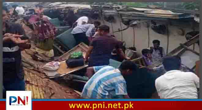 ڈھاکہ(شِنہوا)بنگلہ دیش کے دارالحکومت ڈھاکہ سے تقریبا 117 کلومیٹر شمال مشرق میں ضلع کشور گنج میں دو ٹرینوں کے تصادم میں کم سے کم 15 افراد جاں بحق ہو گئے۔ضلع کے ایڈیشنل سپرنٹنڈنٹ آف پولیس محمد مستک سرکار نے پیر کے روز شِنہوا کو بتایا کہ بندرگاہی شہر چٹوگرام کی طرف جانے والی کنٹینر ٹرین ڈھاکہ جانے والی ایگاروسندھور ایکسپریس سے مقامی وقت کے مطابق پیر کو دوپہر3 بجکر 30 منٹ پرٹکرا گئی۔